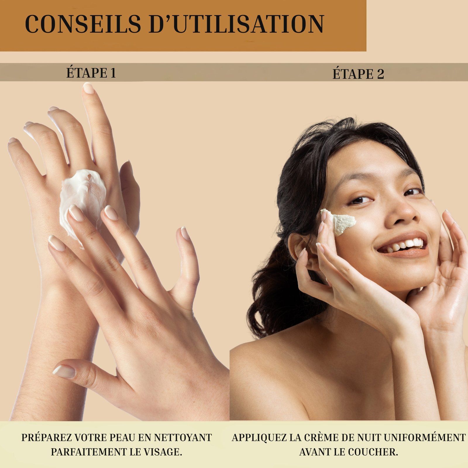 Appliquer une fine couche de crème le soir sur une peau propre et sèche, en évitant le contour des yeux. Masser délicatement jusqu’à absorption complète. Pour de meilleurs résultats, utiliser quotidiennement.