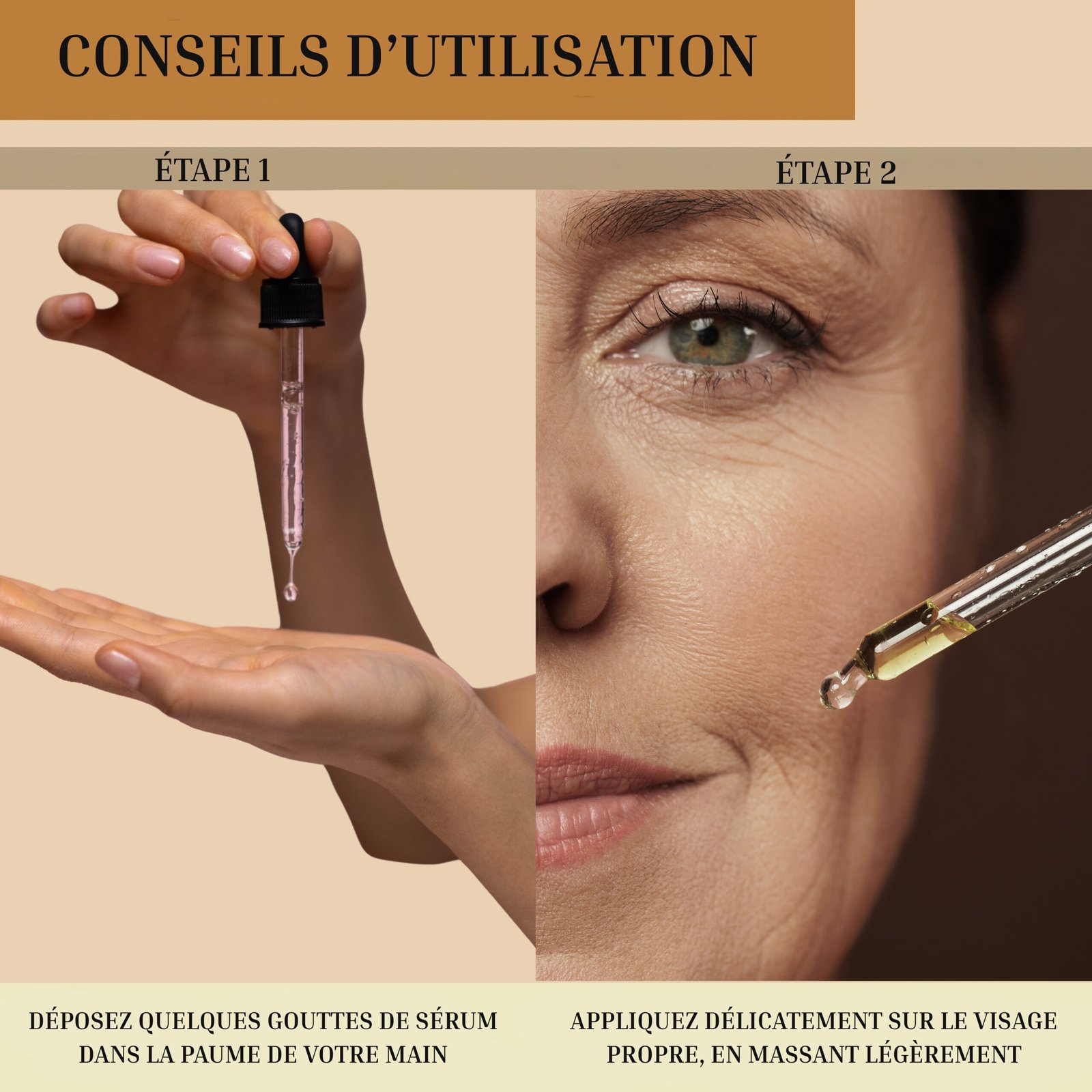 Appliquer quelques gouttes du sérum sur peau propre et sèche, matin et soir, en massant doucement du bout des doigts en mouvements circulaires. Laisser pénétrer avant d’appliquer une crème de jour ou de nuit. Pour de meilleurs résultats, utiliser régulièrement.